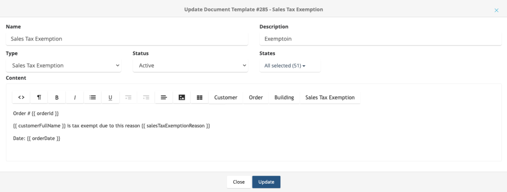Click Add Document Template and choose Sales Tax Exemption as the type
