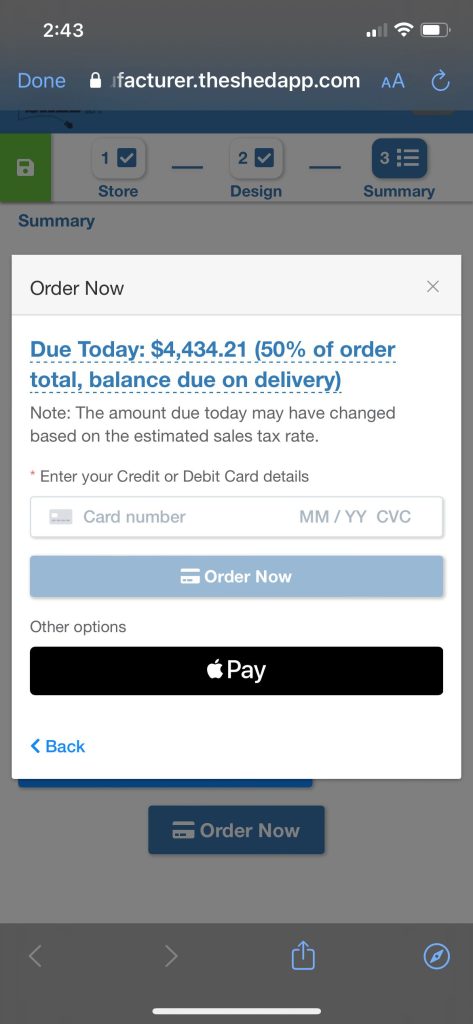 - Yes, a customer can pay for their shed with Apple Pay and Google pay on the order form.